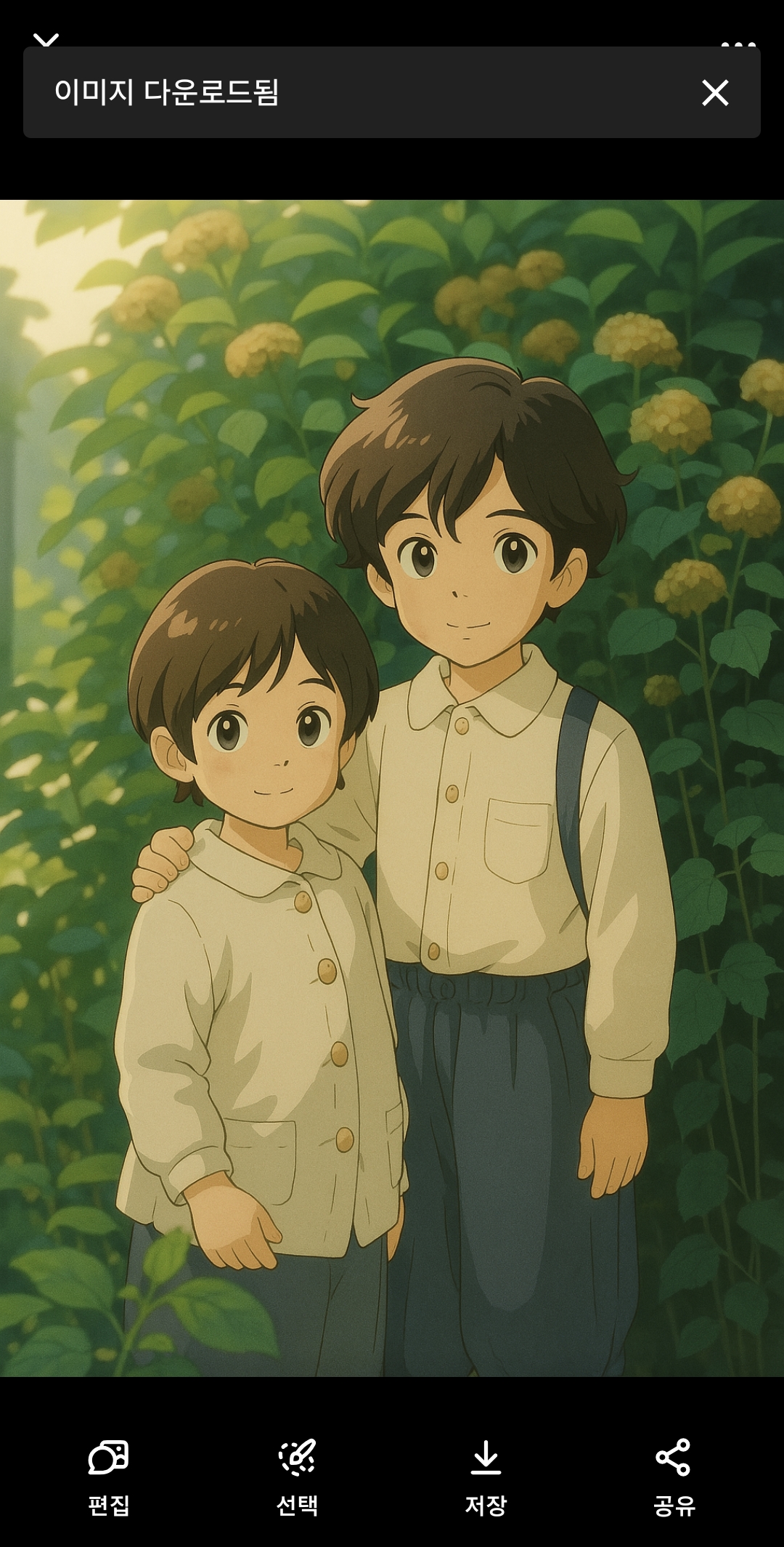 지브리풍 그림이 완성되면 생성된 그림을 클릭하시면 아래탭 부분에 편집 선택 저장 공유 등의 원하시는 버튼을 클릭해서 다운로드 후 사진첩에 다운로드 된 이미지로 카톡 프사를 변경하실 수 있습니다.