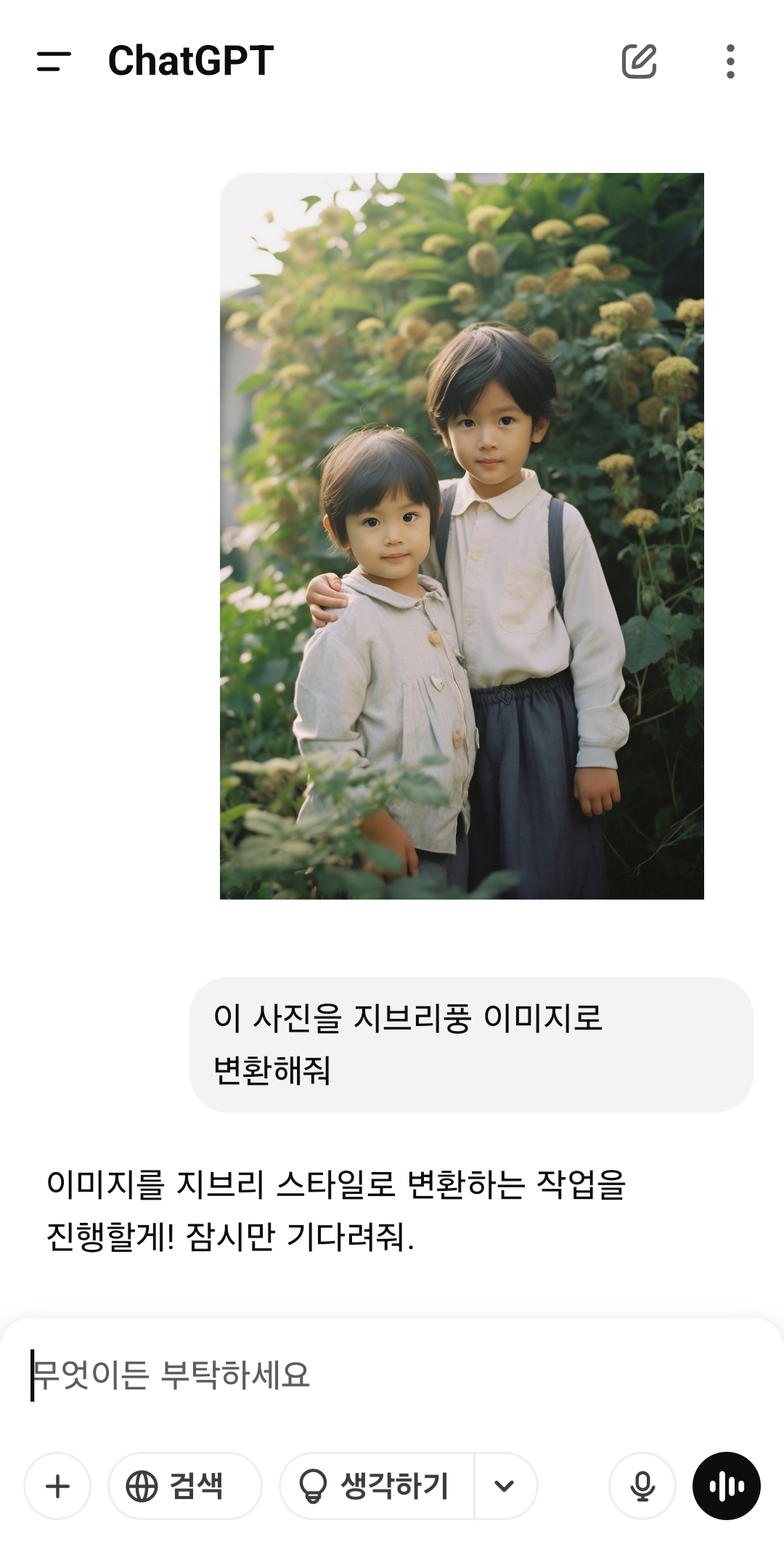 "이 사진을 지브리 애니메이션 스타일로 변환해줘. 부드러운 색감, 몽환적인 배경, '이웃집 토토로' 또는 '센과 치히로의 행방불명' 같은 느낌으로 만들어줘"